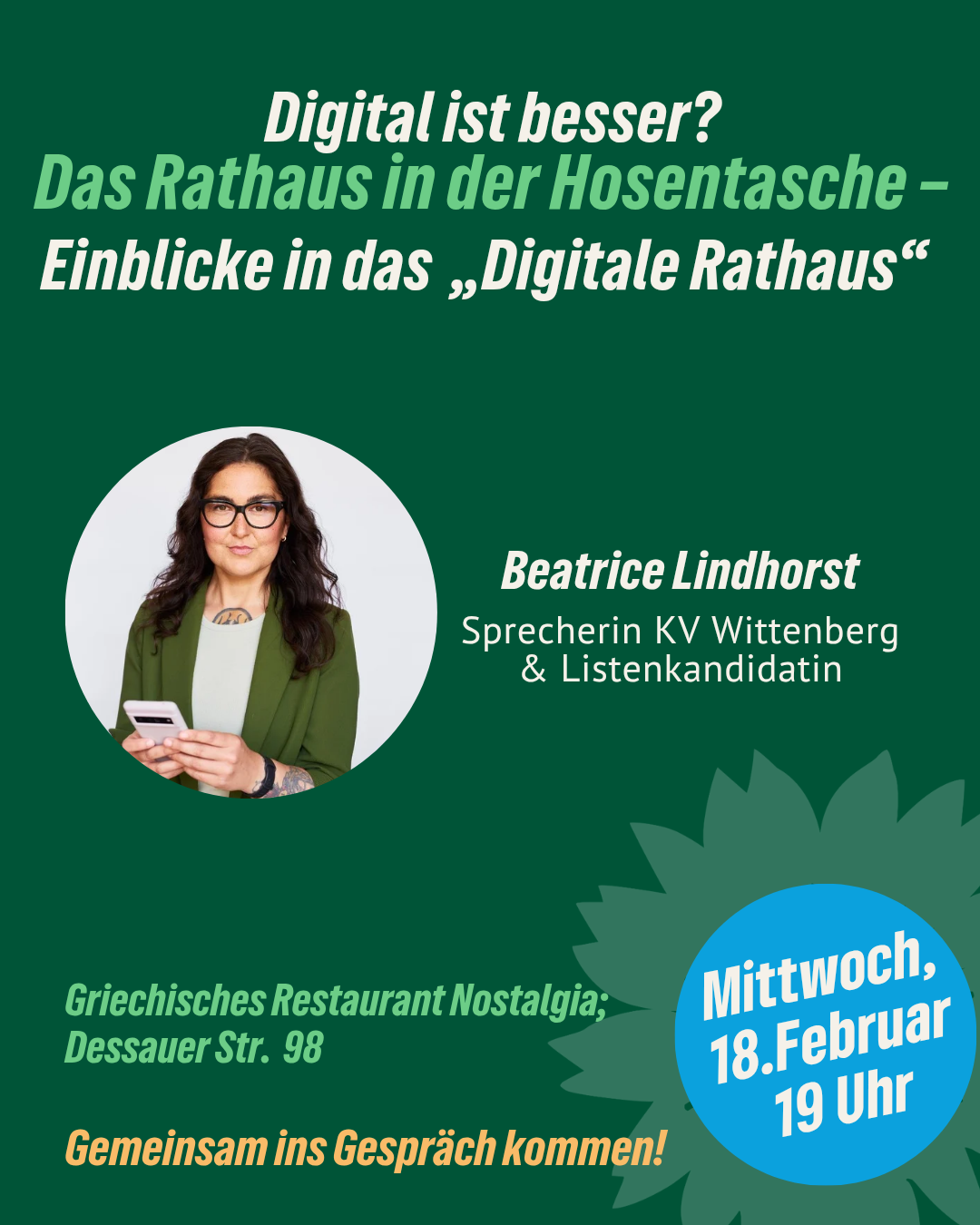 Darüber sprechen wir am Dienstag, 18. Februar, ab 19 Uhr mit Beatrice Lindhorst, grüne Digitalexpertin, Sprecherin der Grünen Wittenberg und Landtagskandidatin (Listenplatz 7).